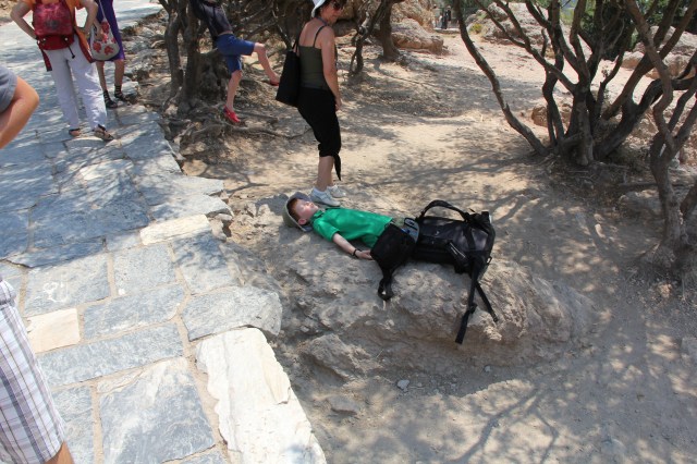 38 degrees celsius in Athens today.  Really dry heat.  The kind of heat where you drink a litre of water and feel thirsty again a minute later. We got some wise advice that visits to the Acropolis are best done first thing in the morning or very late afternoon.  Acropolis literally means “high city” and there is no shade up there – people regularly pass out.