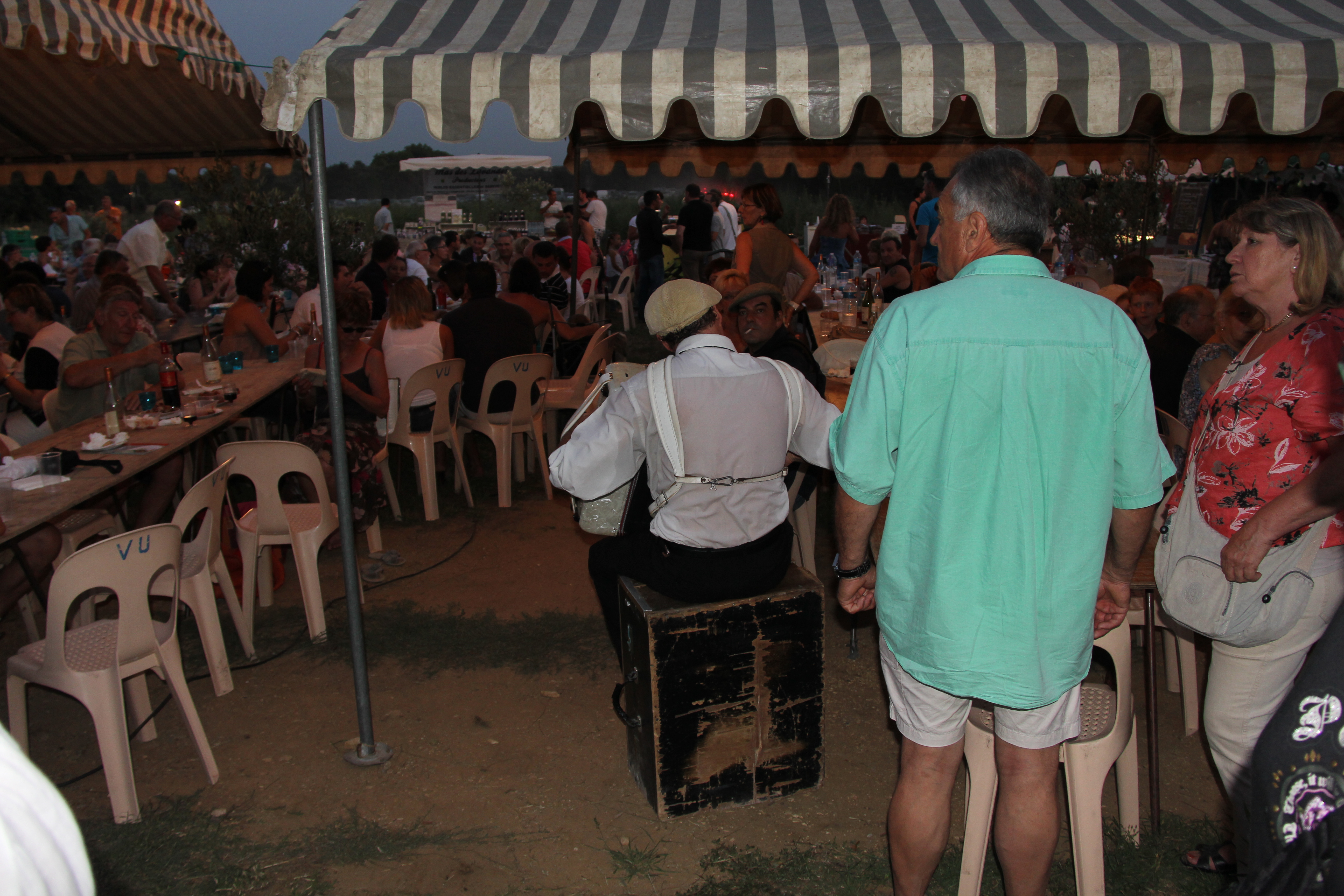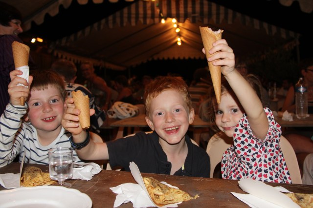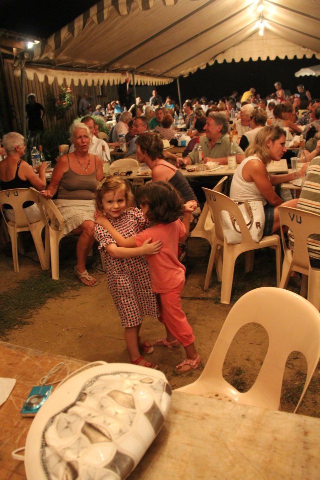 There was laughing, singing and dancing along to the accordions but the show was slightly stolen when Sari got up to dance and another 4 year old named Nida joined her and showed her how to slow dance. The crowd went crazy and everyone clapped along ……Sari was absolutely delighted by her surroundings and her new found audience of around 250 french people who were already well lubricated.