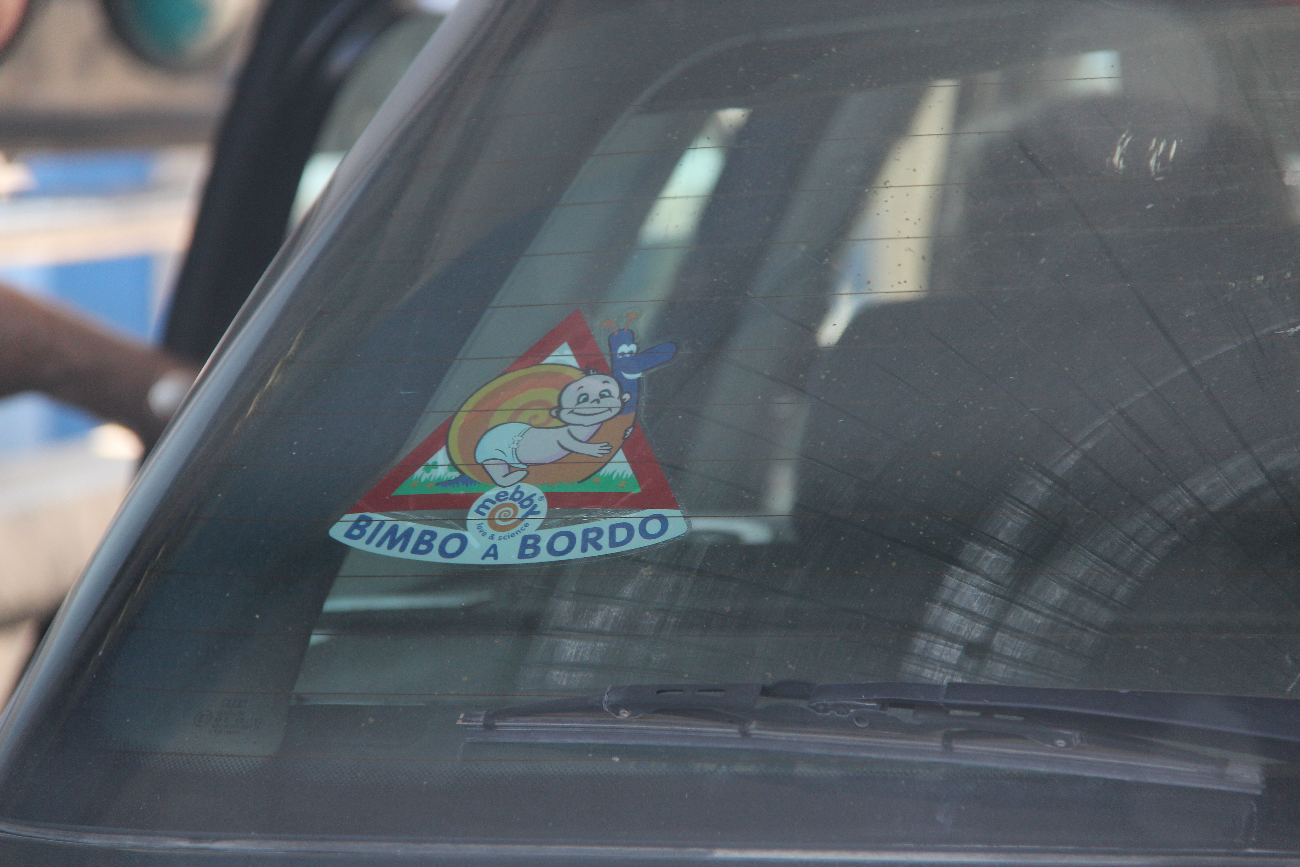 My moment of blog ecstasy was on Saturday morning on the Autostrade heading from Belforte to Rome. Sitting behind a small car that had a sticker on it’s back window …………..well let’s just show you what it said…..