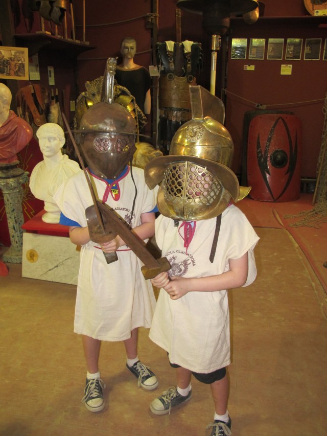 Today the boys and I attended Gladiator School where a reasonably intense gentleman (possibly an off-duty taxi driver) took us through two hours of attacking and defensive sword moves. Thankfully the swords were wood otherwise our trip may have been over as of today – try containing a 9 and 7 year old to the five official sword moves of a Gladiator! They actually both got it at the end of the lesson but then wanted to add some pretty fancy Jedi twists which the instructor did not approve of – not authentic apparently. Anyway it was great fun with lots of “Aves”, “Vales” and bruised knuckles.