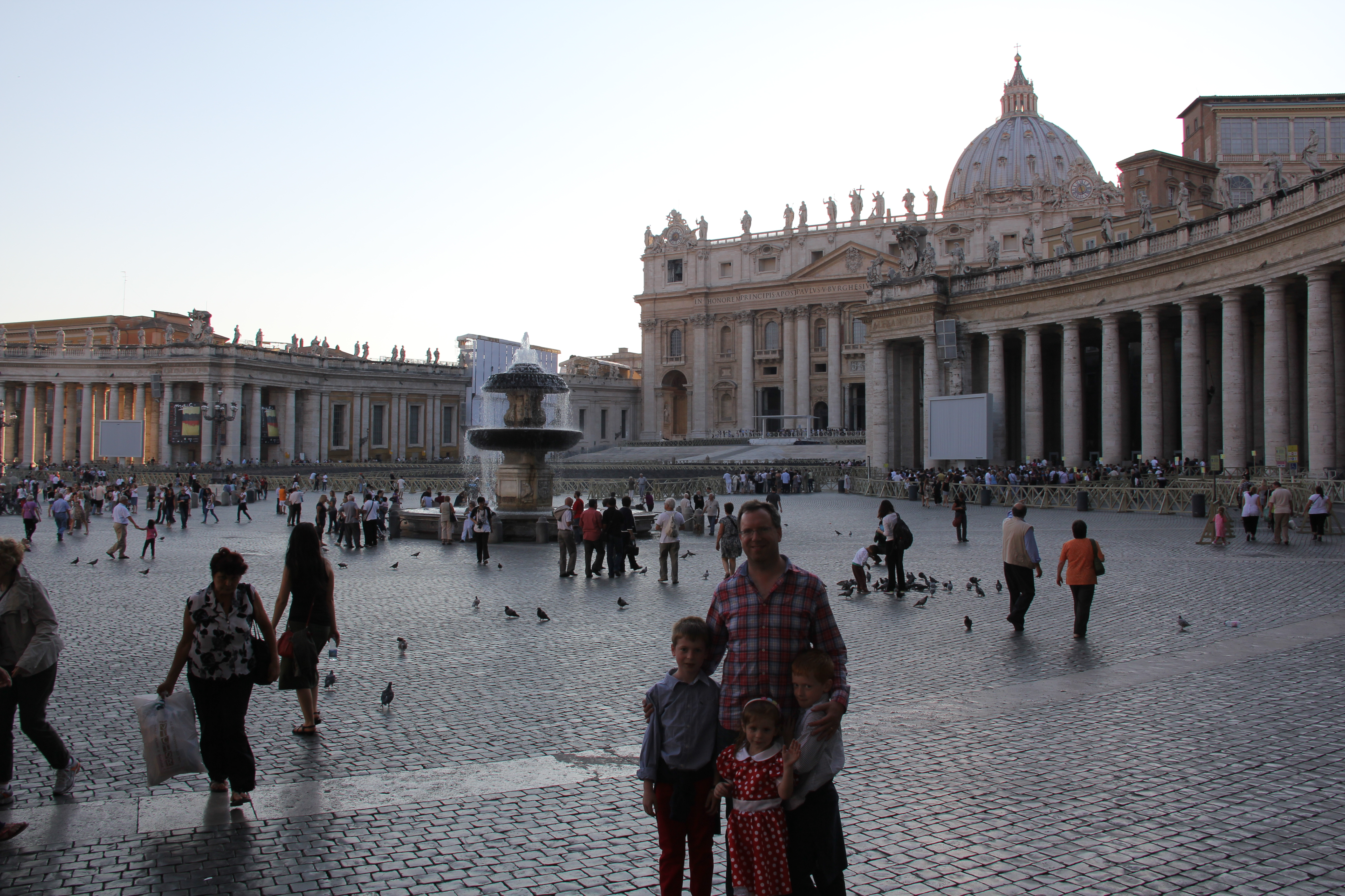 In this day and age it can take a lot to make children stop in their tracks and just stare in awe. Ours were a little testy after their long drive in the car but Bec and I both smiled at their reaction as we crossed into the walled enclave of the Vatican City. For the first few moments they just stood silent and still. Then Foster said “this is awesome” and the other two nodded in complete agreement. The sun was setting and the whole area just seemed full of warmth – everyone smiling, looking relaxed and in awe of the views in every direction.