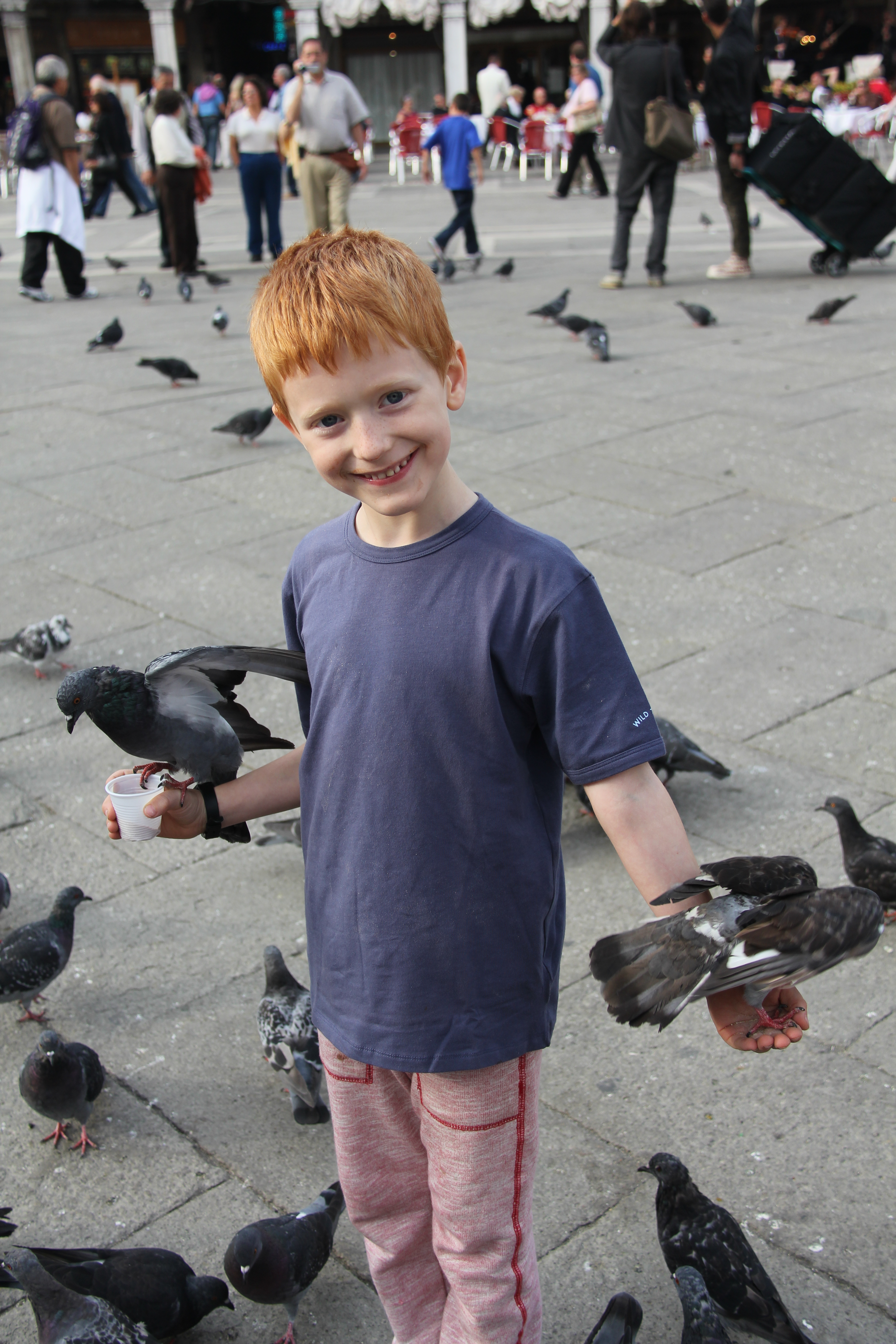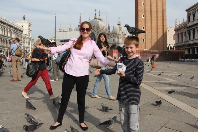 We DID go to St Mark’s Square everyday and feed the pigeons until they were too flat to fly (and found out that it was illegal on our last day. Sorry Ms Nasty Policewoman). Bec had found a small supermarket which sold 2 litre buckets of bread crumbs for 90 cents a pop, and promptly bought four. Our children consequently made several hundred winged friends many of whom would happily perch of Mylo’s hand, Sari’s shoulder or Foster’s head (often all at the same time). This of course also drew in other children and was enormous fun.